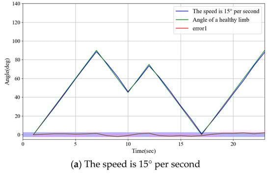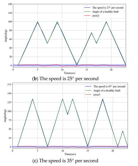 During the actual rehabilitation process, the movement speed of the unaffected limbs is controlled by the patient’s volitional control. The objective of this experiment was to investigate whether variations in speed could influence the responsiveness of the robot control system to synchronous movements of both limbs and to ensure the safety of rehabilitation training. The experiment established three speed settings for unaffected limb movement: low speed at 15°/s, suitable for gentle rehabilitation training; medium speed at 25°/s, appropriate for moderate-intensity functional recovery exercises; and high speed at 45°/s, conducive to improving movement coordination and flexibility. The synchronization error between both limbs was evaluated by recording angular changes in the unaffected and affected limbs. The experimental results, as illustrated in Figure 13, demonstrate that the robot can maintain high synchronization and stability under various speed conditions.