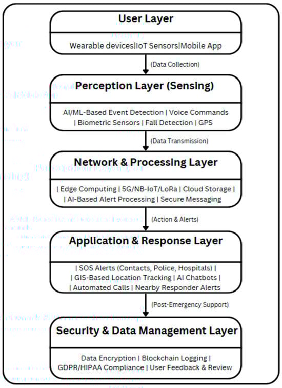 User Layer: This layer bridges various devices and applications that the user would interact with: wearable sensors, mobile applications, or IoT-based monitoring systems. The types of devices will allow activating distress signals in two unique ways: manual SOS activation (button press, shake detection) and automatic detection (fall detection, biometric anomalies, or AI-based voice recognition).