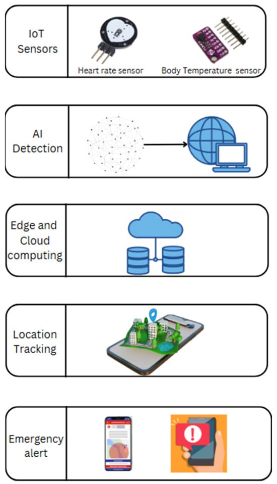 Perception Layer (Sensing): The layer collects data from different sensors and systems for health emergencies or personal safety acts detecting threats. AI/ML algorithms analyze biometric information, motion patterns, and voice recordings to check for emergency events. For instance, in the health monitoring case, the biosensors detect abnormal vital signs using some abnormal characteristics, such as a high heart rate or sudden falls. In the case of assault prevention, through AI, a voice recognition system detects specific distress phrases, hence triggering an alarm. Likewise, during this stage, GPS location data will also be captured to support responders.