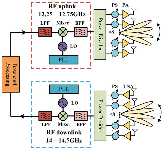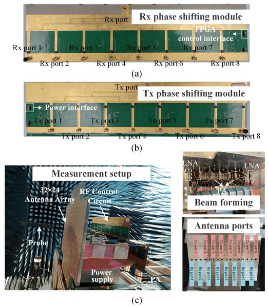 x-direction. During the measurement process, each of the eight Rx ports is connected with low noise amplifiers (LNAs); then, eight coaxial cables for connecting the LNAs and the phase-shifting module are adopted. The Tx band ports are connected with eight phase-shifting channels separately, and the power amplifier (PA) is placed in front of the power divider for convenience.