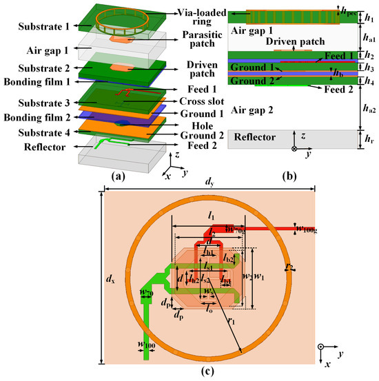Specifically, the dual-polarized dual-band antenna element spacing is designed as ( is the free space wavelength at 14.25 GHz and is the free space wavelength at 12.5 GHz). The seven metal layers from bottom to top are Feed 2, Ground 2, Ground 1, Feed 1, Driven patch, Parasitic patch, and Via-loaded ring. The first four layers are located on Substrates 2–4, and the last two layers are printed in Substrate 1. In detail, Feed 1 and Feed 2 are employed as the feed-line for dual-polarization operation at the Tx and Rx bands, respectively. The I-shaped slot is introduced for the slot-coupling excitation with broad bandwidth performance. Furthermore, Ground 1 and Ground 2 between the two above feed networks are introduced to reduce the coupling between two dual-polarized ports and then to enhance the port-to-port isolation. The slot-coupled octagonal Driven patch is located on the top layer of Substrate 2. The patch is symmetric along the x- and y-directions, which guarantees the shared-aperture radiation of the dual-polarized waves. An Air gap is added between Substrate 1 and Substrate 2 to enhance the broadband characteristic. In addition, an octagonal Parasitic patch on the bottom layer of Substrate 1 and the Via-loaded ring embedded in Substrate 1 is utilized to increase the gain performance and decrease the coupling between the antenna elements.