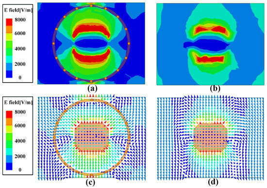 The electric field distributions in Substrate 1 of the antenna element with and without the Via-loaded ring are shown in