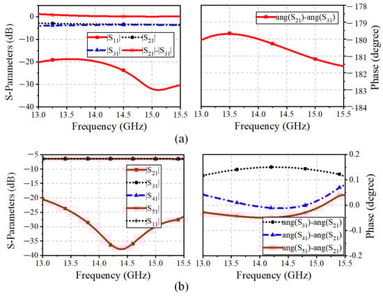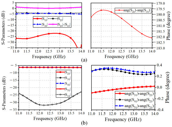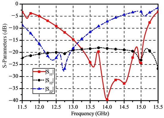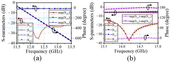 | is less than −20 dB between 13.5–15 GHz and 11.5–13.0 GHz. The amplitude and phase differences between the two output ports are less than 0.7 dB and 0.25°. In this way, the proposed three-port ring couplers are responsible for achieving the differential feed with the compact structure and suppressing the cross-polarization level.
