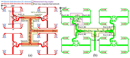 Figure 5a,b, respectively. Specifically, a differential feed scheme based on a miniaturized ring coupler is adopted for the excitation of adjacent elements. The out-of-phase currents can suppress the unwanted leakage radiation and the cross-polarization component. A four-way corporate feed network is responsible for consistency in the amplitude and phase of the 4 × 4 antenna array. Furthermore, the dielectric cover effect introduced by Substrate 2 increases the dielectric loss of the Tx-band feed network (i.e., Feed 1).