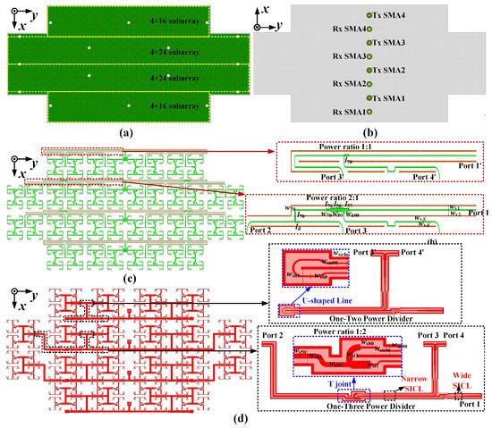 In detail, the metal Via walls of the Rx-band one–three power divider embedded in Substrate 4 are proposed to reduce the coupling between the adjacent MS lines aligned in parallel. Furthermore, Ground 2 on the upper layer of Substrate 4 is placed between the PP layer and the Rx-band feed network, which can effectively suppress the surface wave and transmission loss. Meanwhile, the metallic Vias of the Tx-band SICL feed line are embedded in Substrates 2 and 3. The feeding structures with a wide–narrow–wide–narrow–wide SICL for the Tx-band one–three power divider contribute to achieving the wide impedance bandwidth, and the shared metallic Vias between the adjacent narrow-SICL structures are responsible for the suppression of the coupling with a miniaturized feed network design. In addition, compared with the one–three power divider, only the T-junction for feeding the additional port is replaced with a U-shaped line for the one–two powder divider, ensuring in-phase excitation.