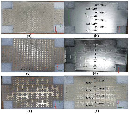 Figure 10. The proposed antenna arrays are fabricated by printed circuit board (PCB) and computer numerical control (CNC) machining technology. A metal Reflector cavity consisting of rectangular and cross-shaped supporting metal blocks is introduced as the container for the antenna array, machined by aluminum plate and treated by conductive oxidation. As shown in