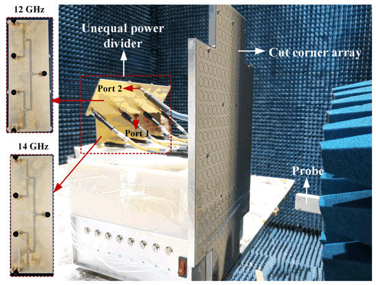 Figure 10d, these metal blocks can serve as a supporting structure between the antenna array surface and the metal Reflector. Four Tx SMA ports and four Rx SMA ports on the metal Reflector are used to connect with the T/R RF modules. Furthermore, the S-parameters are obtained by Keysight N5247B. The radiation patterns and gains are measured by the planar near-field anechoic chamber technology, and the photograph of the measurement setup is shown in
