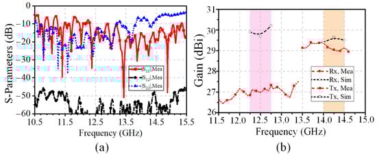 Figure 12a. The results show that the measured impedance bandwidths of the Rx and Tx ports are 22.1% (10.57–13.33 GHz) and 21.1% (12.31–15.32 GHz), respectively. The isolation is better than 47.5 dB in the Tx and Rx bands. In addition, the simulated and measured normalized radiation patterns at the Tx and Rx bands of the antenna array are shown in