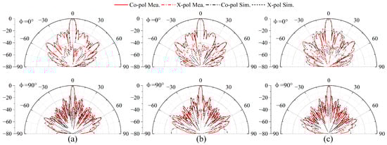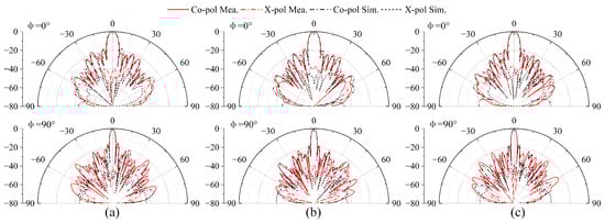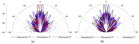 Figure 17a,b. Due to the limited scanning angle requirements, the scanning range designed here is relatively small. The measurements show that the radiation pattern can be steered over the elevation range from −5° to 5°. The measured radiation patterns are in good agreement with the simulated ones. As shown in