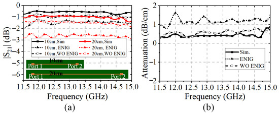 Figure 12b. It can be seen that the measured and simulated gains at the Tx-band are highly satisfactory. However, the simulated gain is 2.4 dB higher than the measured ones at 12.5 GHz. In fact, the difference is caused by the influence of surface metal coating during the fabrication. The comparison of the simulated and measured MS-line insertion loss with and without electroless nickel immersion gold (ENIG) technology is illustrated in