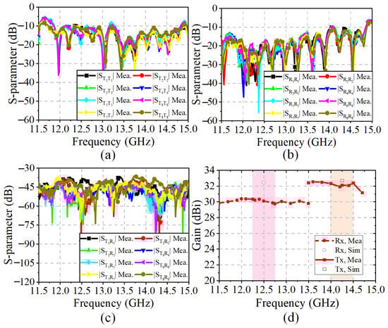 Figure 18a,b, the measured bandwidths of all the Rx and Tx ports are 26.1% (from 10.85 GHz to 14.1 GHz) and 11% (from 13.3 GHz to 14.85 GHz), respectively. The ports working in the Tx-band are greatly affected by the SMA welding; therefore, the S-parameters of these ports are inconsistent.