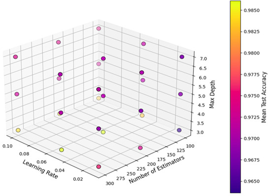 Figure 4 below, the effect of hyperparameters on the accuracy rate of the GBM model is shown in three dimensions. The visualization illustrates the impact of various hyperparameter combinations on overall model accuracy.