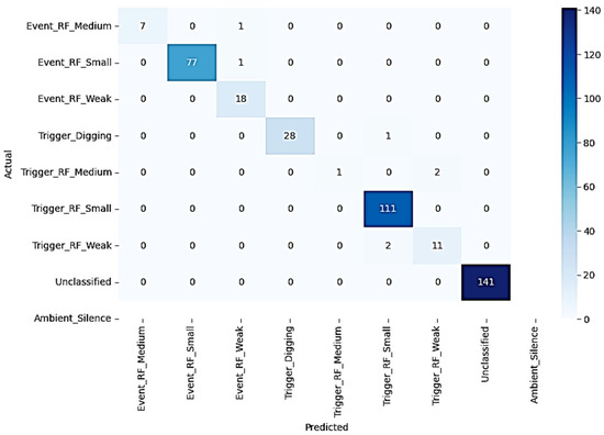 In addition, the AUC values of the model, calculated separately for each class, ranged from 0.9982 to 1.0000. The AUC value was calculated as 1.0000 for some classes, and it was observed that the model made error-free predictions in these classes. Especially in Ambient_Silence, Trigger_Digging, and Event_RF_Small classes, AUC = 1.0000 was obtained. In addition, even in courses with low support numbers, such as Event_RF_Weak and Trigger_RF_Weak, AUC values were above 0.98. These findings show that the model successfully distinguishes all classes and performs well even in imbalanced datasets.