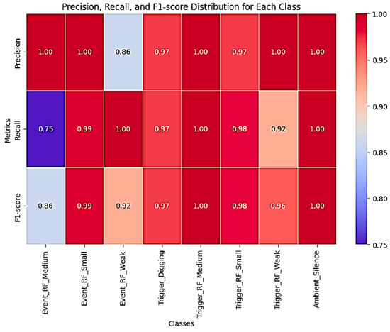 The Soft Voting strategy provides more accurate results by taking the weighted average of the prediction probabilities of each model. This strategy has allowed elevated precision rates to be achieved in most classes. For example, in classes such as Ambient_Silence and Event_RF_Small, the accuracy rates of the model have reached values as high as 100%. Soft Voting combined the prediction probabilities obtained from each classifier model of the model, preventing erroneous classifications and increasing the model’s generalization capability. The Hybrid Voting Classifier combines the probability outputs of each base model, such as RF, GBM, XGBoost, and SVM, in a weighted manner, ensuring adequate attention is given to underrepresented classes. As a result, the recall scores for minority classes increased significantly, without any noticeable drop in overall precision and F1 score in