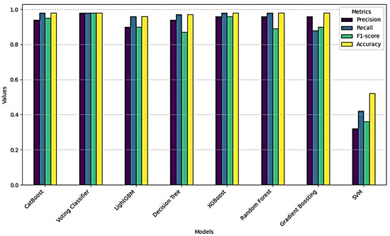 To compare the performance of different machine learning algorithms, the success of the Voting Classifier model was compared with models such as CatBoosting, XGBoost, RF, Gradient Boosting Classifier, LightGBM, Decision Tree, and SVM. The results obtained were examined on basic metrics such as precision, recall, F1 score, and accuracy of each model. The Voting Classifier model exhibited the highest performance of all models. In particular, high results such as 0.98 were obtained in precision, recall, and F1 score values. This means that the model makes highly reliable predictions for each class and is particularly validated through experimentation in unbalanced classes. The SVM model showed the lowest performance in the study with low precision (0.32), recall (0.42), and F1 score (0.36). This result revealed that the SVM model was adversely affected by data imbalance. Although CatBoost and XGBoost achieved commendable performance metrics, they were outperformed by the Voting Classifier in both precision and generalization. It has expanded the discussion to compare our hybrid Voting Classifier against individual base models SVM, RF, XGBoost, and GBM. The ensemble consistently outperforms each standalone model in precision, recall, and F1 score in