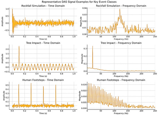 It illustrates the feature extraction methodology by showcasing example waveforms from multiple event categories, such as rockfall and tree obstruction. Each event type exhibits unique signal characteristics in both time and frequency domains. For instance, tree obstructions produce high-energy, short-duration spikes, while rockfalls exhibit broader spectral content and longer decay patterns. By analyzing signal energy, zero-crossing rate, and frequency centroid, we capture these distinctions and encode them as input features for classification.