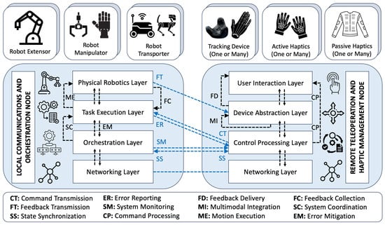 Layered architecture of the immersive teleoperation system, divided into the Remote Teleoperation and Haptic Management Node (RTHN) and the Local Communications and Orchestration Node (LCON). The RTHN layers process user inputs and deliver multimodal feedback through haptic and tracking devices, ensuring seamless control over the robotic system. The LCON layers coordinate task execution, integrating commands from the RTHN for precise and dynamic operation. Inter-layer interactions facilitate real-time communication, while high-level orchestration ensures task efficiency and system synchronization.