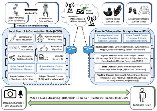 To support real-time bidirectional control, the system employs multiple communication protocols across different layers. At the hardware interface level, the UR5e communicates with the OnRobot RG2 gripper via Modbus RTU over USB-serial, while real-time robot-data exchange occurs over RTDE. Within the LCON, core control services run over ROS Noetic, while XML-RPC interfaces expose control commands and sensor status to the RTHN. Inside the RTHN, haptic and tracking control data are marshaled via TCP for tracking and UDP for haptic frames. Audio and video streams originating from the camera and microphone are transmitted via RTSP for session control and RTP for media delivery over the private 5G network. Sensor data from trackers and haptic devices, ranging from USB-serial to BLE interfaces, are received, normalized, and passed through the device abstraction layer, ensuring modular and interoperable integration of heterogeneous devices across the system.