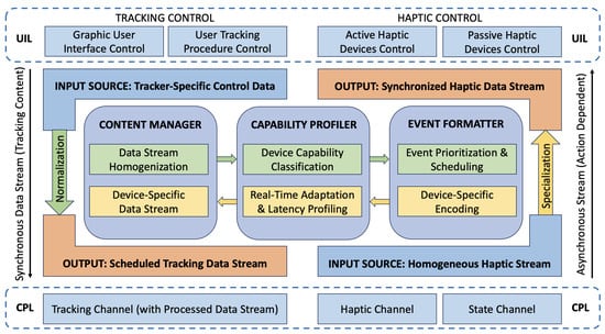 Bidirectional functional architecture of the device abstraction Layer, depicting the dual pipelines for (left) tracking input normalization and (right) haptic output specialization. The core components—Content Manager, Capability Profiler, and Event Formatter—ensure real-time synchronization, dynamic profiling, and abstraction of heterogeneous tracking and haptic devices. Data streams are routed from the user interaction layer (UIL) to the control processing layer (CPL) to ensure modular and low-latency communication.