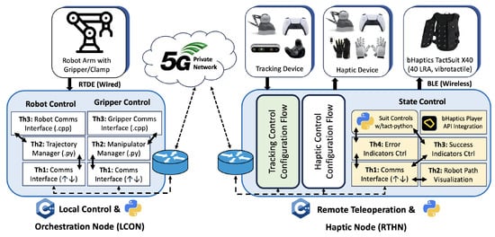 The proposed teleoperation system, shown in Figure 2, is built upon a modular and device-agnostic architecture designed to enable seamless integration of diverse haptic feedback and tracking devices. By abstracting device-specific functionalities, the system achieves adaptability and scalability, allowing users to interact effectively in various configurations ranging from single-user set-ups to multi-user collaborative environments. This section elaborates on the structural design of the system, focusing on the core architecture, the device-agnostic layer for interoperability, and the integration of haptic and tracking devices tailored to immersive teleoperation tasks.