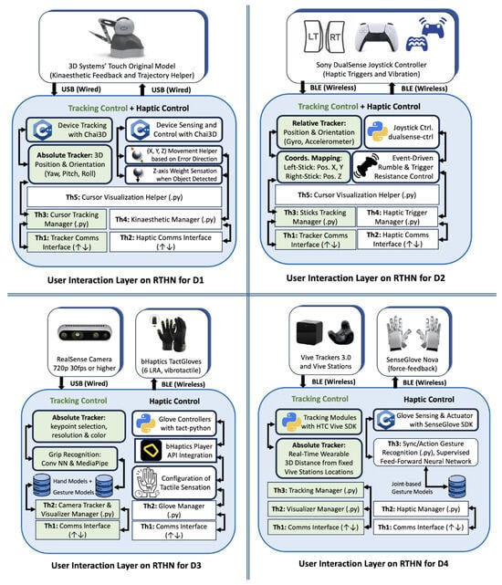 User interaction layers for the RTHN in diverse device configurations. Top Left (D1): Touch Device. Top Right (D2): DualSense controller. Bottom Left (D3): bHaptics TactGloves with RealSense camera. Bottom Right (D4): SenseGlove Nova with Vive Trackers.