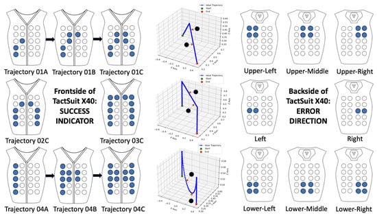 In the proposed system, the bHaptics TactSuit X40 (bHaptics Inc., Seoul, Republic of Korea) is employed as a directional passive haptic feedback interface, leveraging its spatially distributed vibrotactile actuators on both the front and back panels to deliver semantic guidance during teleoperation as shown in Figure 6. The front actuators are exclusively mapped to indicate successful path-following behavior, wherein each point of contact along the expected trajectory is dynamically transformed into an actuator index using normalized screen coordinates and a grid mapping logic. These indices are activated using a fixed-intensity front-facing vibration pattern. Conversely, back actuators are used to convey error feedback, driven by the direction and magnitude of the deviation vector between the actual and ideal trajectory. The system classifies directional errors into 1 of 15 predefined regions (e.g., upper left or lower right) and activates the corresponding actuator clusters on the back panel, with the intensity scaled to the error norm. This dual-region design ensures a cognitive and spatial separation of feedback semantics, where success is gently reinforced via front haptics and error is emphatically redirected via back haptics, enabling intuitive, non-visual corrective guidance during immersive robotic teleoperation scenarios.