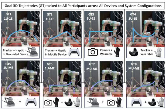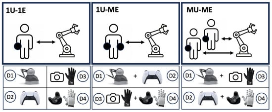 - 1U-1E: One User with One Equipment. In this configuration, a single user operated one device at a time, evaluating its standalone capabilities in performing teleoperation tasks.