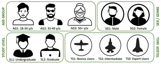 Pariticipant characterizations based on four key demographic and skill-related attributes: age group (AG), sex or gender (SG), study level (SL), and teleoperation skill (TS).