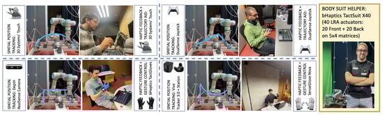 The experimental design incorporated three distinct operational configurations to evaluate the system’s performance and adaptability under varying user and equipment set-ups, illustrated in Figure 7. Each configuration utilized a specific combination of haptic feedback and tracking devices for real-world teleoperation tasks.