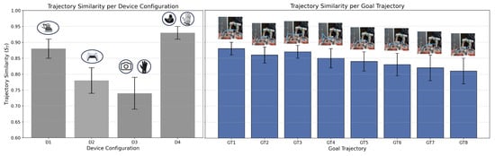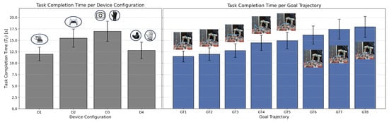 Temporal efficiency () was defined as the average time required by participants to complete a given task over three optional tries, from initial object manipulation to placement along the prescribed trajectory. This metric directly assessed the responsiveness of the system and the user’s ability to operate efficiently. This metric aligns with established teleoperation studies that link quicker task execution to enhanced performance [43,44]. Completion times were recorded for each XU-XE configuration and trajectory complexity, with statistical analyses performed to determine means, variances, and potential performance bottlenecks.