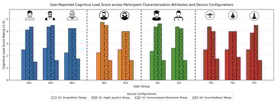 The distribution of participants across demographic and skill-related categories was designed to maintain balance and diversity. Specifically, 26% of the participants belonged to AG1, 39% belonged to AG2, and 35% belonged to AG3. Regarding teleoperation skill levels, participants were classified as follows: 35% TS1, 39% TS2, and 26% TS3. Gender representation was also balanced, with 57% identifying as male and 43% identifying as female. Finally, for the study level of the participants, 22% were classified as SL1, and 78% were classified as SL2. These proportions ensured a heterogeneous sample, allowing for robust subgroup analysis of performance and experience metrics.