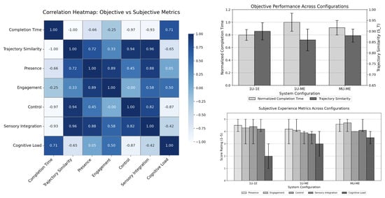 Temporal efficiency, while less strongly correlated with subjective metrics, showed a significant impact on the engagement scores. Faster task completion times, particularly in the 1U-1E configuration with D4, were associated with higher reported enjoyment and focus levels. Conversely, configurations involving D2 and D3, which exhibited greater variability in completion times, often led to frustration and decreased engagement.