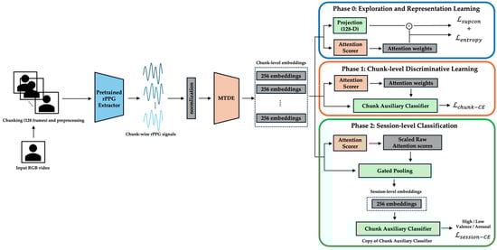 End-to-end pipeline for rPPG-based emotion recognition. An RGB video is separated into 128-frame segments (≈4 s), converted to rPPG waveforms using a pretrained PhysMamba, encoded using the Multi-scale Temporal Dynamics Encoder (MTDE), and optimized through Phase 0, Phase 1, and Phase 2, which are delimited by blue, orange, and green outlines, respectively. The arrows indicate the direction of the data flow and processing sequence.