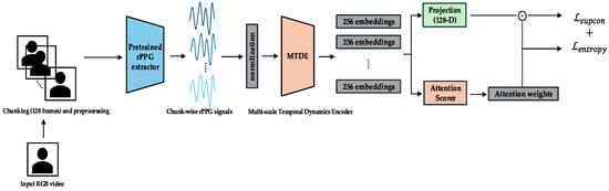 The complete end-to-end pipeline, together with its three curriculum phases, is shown in Figure 1. Raw RGB video is segmented into 128-frame chunks (≈4 s at 30 fps) and converted to rPPG waveforms by a pretrained PhysMamba extractor. Each chunk is then encoded by the Multi-scale Temporal Dynamics Encoder (MTDE). Depending on the training phase, different modules become active: the projection head and in Phase 0 (Figure 2), the chunk auxiliary classifier and Top-K α-Entmax attention in Phase 1 (Figure 3), and the Gated Pooling plus session classifier in Phase 2 (Figure 4). At inference time, the green-outlined path in Figure 1 (MTDE → α-Entmax → Gated Pooling → Main Classifier) constitutes the operational model.