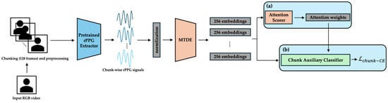 As determined by our selection process (Section 3.1.3), the UBFC-rPPG-pretrained PhysMamba model [,]—chosen for its superior SNR and lower VRAM footprint—serves as the rPPG extraction front-end in our framework. Its primary role is to extract a refined, denoised 1D temporal rPPG (blood- volume pulse, BVP) signal from raw facial video frames.