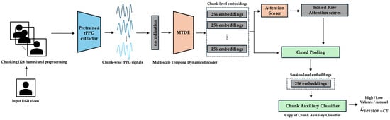 Each temporal chunk is processed using the Multi-scale Temporal Dynamics Encoder (MTDE), yielding a 256-dimensional feature embedding. The embeddings are scored by the attention scoring module (AttnScorer) via α-Entmax attention and, in parallel, forwarded to the Gated Pooling module (Gated Pooling). Gated Pooling integrates the attended and feature-gated embeddings into a single session representation from which the main classifier predicts the valence and arousal labels using only the aggregated temporal information. Phase-specific modules that augment this core path are illustrated in Figure 2 (Phase 0), Figure 3 (Phase 1), and Figure 4 (Phase 2) and are detailed in the curriculum learning section (Section 3.4).