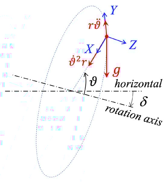 As shown in Figure 3, the components of the acceleration along the axes of the local reference frame , due to the tilted rotation plane, turn out now to be the following: