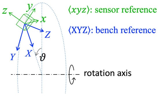 Since no geometrical constraint is imposed on how the accelerometer is mounted on the bench, the actual sensor orientation is unknown. As shown in Figure 4, the misalignment between the sensor reference frame and the bench reference frame can be modeled as a 3D rotation. Naming the acceleration sensed by the accelerometer along its sensing axes , the relationship between and the actual acceleration along the axes of the bench frame is