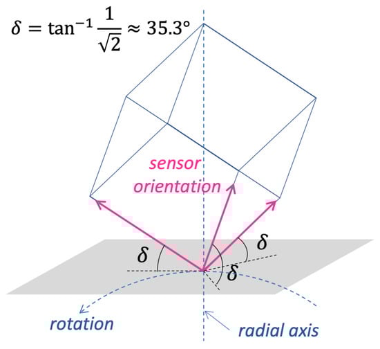 Best sensor orientation. By placing the sensor with the three axes oriented as the sides of a tilted cube having its diagonal along the radial axis, all the sensor axes are tilted on the same angle with respect to the tangential plane.