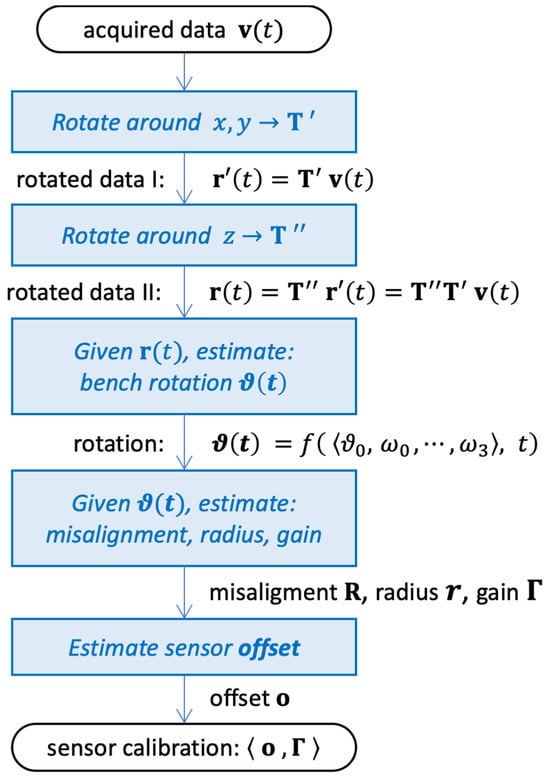 Once the bench rotation is known, the next step involves jointly estimating the sensor misalignment matrix , the gain matrix , and the rotation radius r.