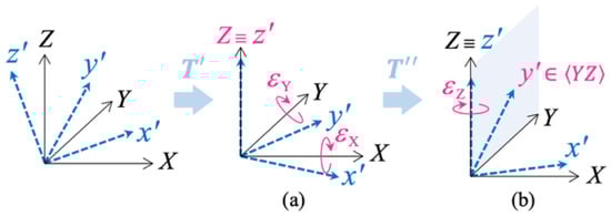 Schematization of the partial alignment step. The reference frame is not orthogonal; therefore it cannot be aligned to by rotation. However, can be rotated so that (a) (rotation matrix: ) and then (b) (rotation matrix: ). The alignment matrix corresponds to the composition of the following two rotations: .