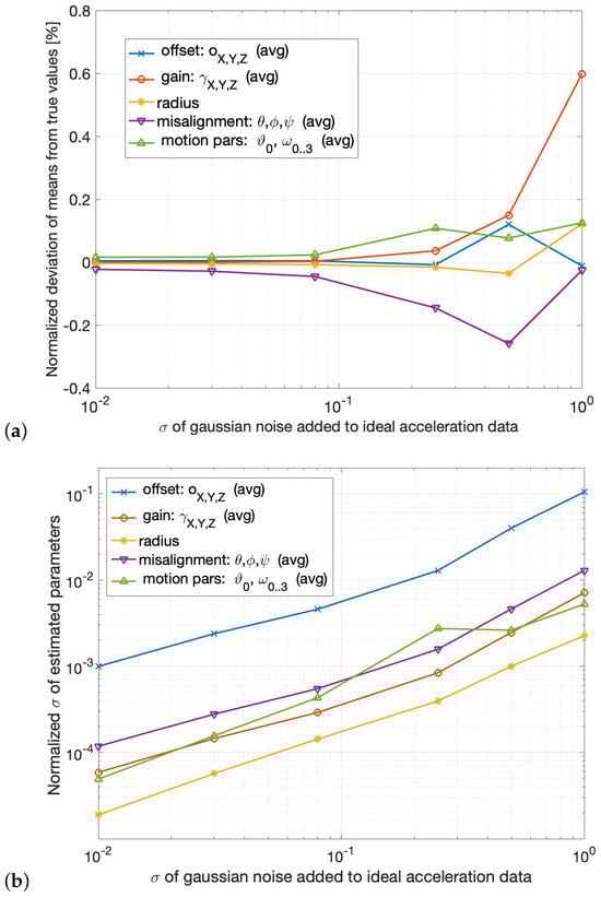 (a) Mean value of the estimated parameters, expressed as normalized difference from the true value. (b) Standard deviation of the estimated parameters, normalized to their mean value (), for different levels (standard deviation) of Gaussian noise added to the ideal acceleration data.
