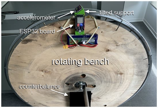 I constructed a simple calibration bench using a common bicycle wheel as a rotating base, as shown in Figure 1. A photograph of the calibration setup is shown in Figure 9. I designed a wireless accelerometer system in which the sensor under calibration—a digital MEMS accelerometer (Invensense™ MPU9250 [])—is interfaced with a battery-powered microcontroller board (ESP32-Wroom []). The board features a Bluetooth interface used for both wireless data acquisition and device control.