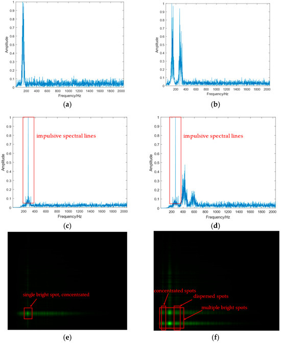According to Formula (6), the squared spectrum of BPSK exhibits impulsive spectral lines, whereas that of QPSK does not. Consequently, in Formula (4), BPSK’s spectral lines manifest as concentrated bright spots, while those of QPSK appear as dispersed spots.