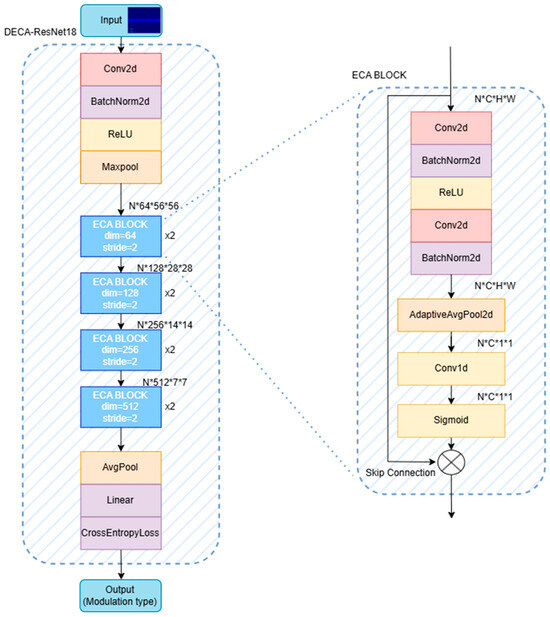As shown in Figure 3, the input to the DECA-ResNet18 network is the joint inner–outer modulation feature map (224 × 224 pixels), fed as dual channels. The input first passes through a 7 × 7 convolutional layer (stride = 2, padding = 3) to extract primary edge and texture features, halving the feature map size. This is followed by BatchNorm2d for activation normalization, ReLU for nonlinear enhancement, and a MaxPool layer to further reduce dimensionality while retaining salient features.