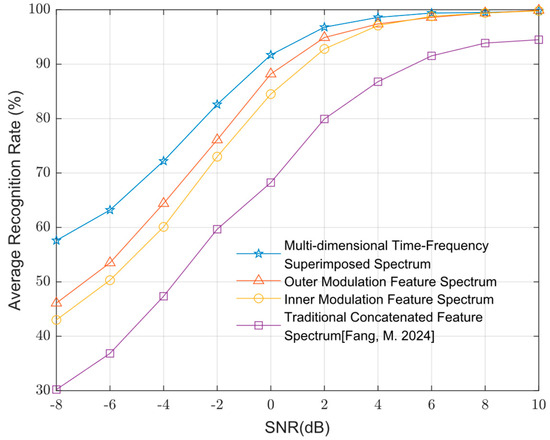 Figure 4 presents the experimental statistical results of the average recognition performance for the signal set using four types of feature maps as model inputs across various SNR levels. The recognition result is for multiple classes. The average recognition rate shown in Figure 4 is the average recognition rate of five modulation types. As shown in Figure 4, the joint inner–outer modulation features achieved an approximately 8% higher average recognition performance compared to using inner modulation features alone and 6% higher than using outer modulation features alone. This indicates that the joint features enable the model to better learn the characteristics of composite modulation signals, significantly improving recognition performance for composite signals under low SNR conditions. The traditional concatenated feature maps, which linearly combine outer modulation time-frequency diagrams, inner modulation spectra, and inner modulation squared spectra as described in Reference [17], yielded the lowest recognition performance.