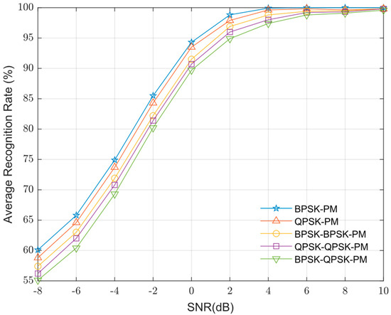 The experimental signal set {BPSK-PM, QPSK-PM, BPSK-QPSK-PM, BPSK-BPSK-PM, QPSK-QPSK-PM} consists of theoretical signals generated in MATLAB 2024a. The specific parameter settings are listed in Table 1. The Inner Modulation Symbol Rate, Sub-carrier 1 Frequency, and Sub-carrier 2 Frequency are uniformly distributed within the ranges specified in the table. Sub-carrier 1 and sub-carrier 2 use different carrier frequency settings to prevent the subcarrier signals from interfering with each other. Given the Gaussian noise-dominated channel characteristics of the TT&C systems targeted by this research, AWGN channel models were employed during simulations for fidelity. For SNR levels ranging from −8 dB to 10 dB with 2 dB intervals, 800 samples per SNR level per signal type were generated, totaling 40,000 samples, with 32,000 for training and 8000 for testing.