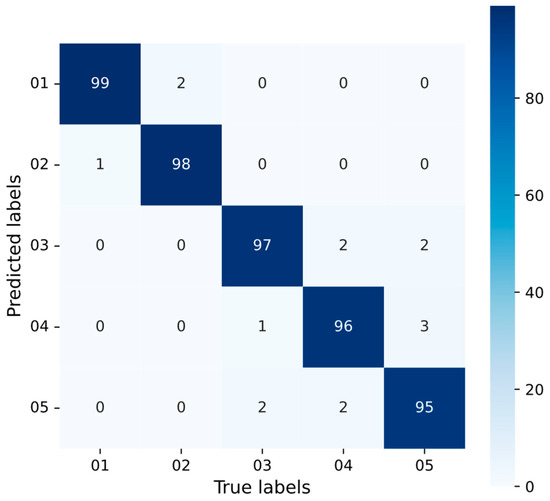 Figure 5 presents the individual average recognition rates of the five modulation types across various SNRs. Figure 6 presents the confusion matrix for five modulation types (2 dB SNR): 01 (BPSK-PM), 02 (QPSK-PM), 03 (BPSK-BPSK-PM), 04 (QPSK-QPSK-PM), and 05 (BPSK-QPSK-PM). As observed in Figure 2, Figure 5 and Figure 6, the MD-TFSS features of BPSK-PM exhibit the simplest and clearest structure, characterized by fewer time-frequency components in the outer modulation feature map and inner modulation features containing only a single concentrated bright spot. These characteristics enable it to achieve the highest recognition rate. Conversely, the MD-TFSS features of BPSK-QPSK-PM display the highest complexity, featuring numerous time-frequency components in the outer modulation feature map and inner modulation characteristics that show multiple concentrated or dispersed bright spots and lines. This structural complexity corresponds to its low recognition rate. In addition, BPSK-PM and QPSK-PM exhibit similar recognition rates due to comparable MD-TFSS feature complexity, as do BPSK-BPSK-PM and QPSK-QPSK-PM.