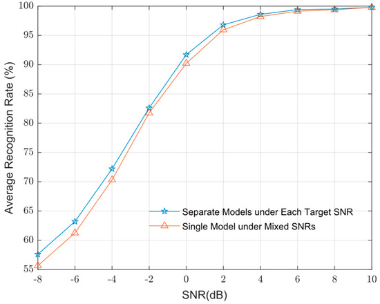 In Figure 7, the recognition performance of the model trained on mixed-SNR data is slightly lower than that of the models trained on individual SNRs. Nevertheless, it still maintains a high recognition rate. These results validate the performance of the proposed algorithm in practical scenarios.