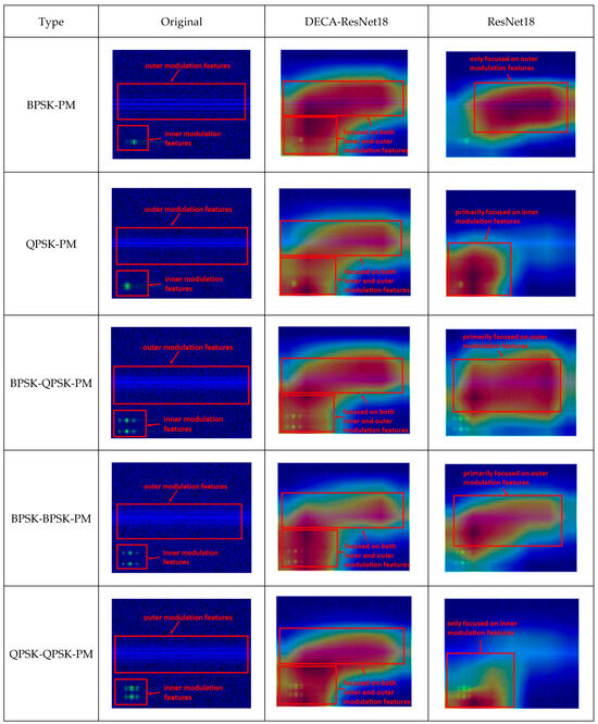 As shown in Figure 8 (where inner and outer modulation feature distributions are marked in the “original” column), the standard ResNet18 over-focuses on either central inner or lower-left outer modulation features, consistent with Section 4. DECA-ResNet18 addresses this by adaptively balancing its attention between dual-channel inputs. Its dynamic weighting mechanism enables complementary feature integration, boosting accuracy and generalization during the blind recognition of multi-carrier composite modulated signals.